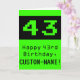 På framsidan av den här generiska och roligt födelsedagspresenten har du en stor grönt av datorspel med stil nummer "43". Det innehåller också hälsning-födelsedagstexten"Lycklig 43-årsdagen" och ett namn som kan anpassas. Insidan innehåller ett hälsning-meddelande från anpassadets födelsedag, eller så kan det kanske rensas och lämnas tomt om ett meddelande ska skrivas för hand i stället. Ett sådant här hälsningskort för en roligt och en stor födelsedag kan användas för att uppmärksamma den fyrtiotredje årsdagen av en datorprogrammerare, en datorhistoriker eller någon som gillar återspelning. [~Z0000430]