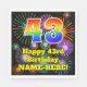 Den glatta och roliga pappra napkindesignen med födelsedagstext har ett stort nummer "43" med en färgstark regnbågsspektrumövertoning som inspirerade mönster, tillsammans med meddelandet "43:e födelsedagen i Lycklig" och ett eget namn. Bakgrunden är ett spännande och färgstarkt mönster som inspirerats av brinnande berömda fyrverkerier. Födelsedag som pappra blöjor som denna kan vara roligt till använda vid en födelsedagsfest som hålls för någon som firar sin fyrtiotredje födelsedag. [~Z0000574]