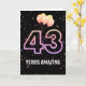 Party-ballonger och konfetti mot svart bakgrund med neon nummer 43 för en 43-årsdag.