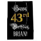 This elaborate and ornate birthday gift bag design features the message “Happy 43rd Birthday,”, plus a custom recipient name. Part of the message is in an elegant script-style text, the large number “43rd” features a faux/imitation gold-inspired look pattern, and the background is colored black. A luxurious gift bag like this might be used when wrapping presents being given to somebody in celebration of their 43rd birthday. [~Z0000560]
