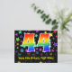 Framsidan av denna spännande, färgglada och roliga födelsedagstematiska vykortdesign har en stor siffra "44" med ett regnbågsspektrum-gradering-mönster, tillsammans med meddelandet "Grattis på 44-årsdagen," och ett personligt mottagarnamn. Framsidan har dessutom ett livfullt och färgglatt bakgrundsmönster med stjärnformer i olika storlekar. Baksidan har ett anpassat födelsedagsmeddelande, eller skulle kunna rensas och lämnas tomt om ett meddelande ska skrivas för hand istället. Ett anpassningsbart födelsedagsvykort som detta kan vara ett roligt sätt att fira någon på deras fyrtiofjärde födelsedag. Vykort som detta kan också användas för att inbjuda gäster till en födelsedagsfest eller