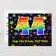 Framsidan av denna spännande, färgglada och roliga födelsedagstema-postkortsdesign har en stor siffra "44" med ett regnbågsspektrum-gradering-mönster, tillsammans med meddelandet "Grattis på 44-årsdagen", och ett personligt mottagarnamn. Framsidan har dessutom ett livfullt och färgglatt bakgrundsmönster med stjärnformer i olika storlekar. Baksidan har ett anpassat födelsedags-hälsningsmeddelande, eller kan kanske rensas och lämnas tomt om ett meddelande ska skrivas för hand istället. Ett anpassningsbart födelsedagskort som detta kan vara ett roligt sätt att fira någon på deras fyrtiofjärde födelsedag. Postkort som detta kan också användas för att inbjuda gäster till en födelsedags