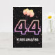 Party-ballonger och konfetti mot svart bakgrund med neon 44 för en 44-årsdag.