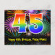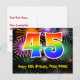 Framsidan av denna spännande, färgglada och roliga födelsedagstematiska postkortsmall har en stor siffra "45" med ett regnbågsspektrum-gradering-mönster. Den har också texten "Grattis på 45-årsdagen," och ett anpassat mottagarnamn. Framsidan har dessutom ett färgglatt och livfullt bakgrundsmönster inspirerat av utseendet på sprängande festliga fyrverkerier. Baksidan har ett redigerbart födelsedagsgratulationsmeddelande, eller kan rensas och lämnas tomt om ett meddelande ska skrivas för hand istället. Ett födelsedags-kort som detta kan vara ett roligt sätt att skicka födelsedagsönskningar till någon som firar sin fyrtiofemte födelsedag. Postkort som detta kan också användas för att in
