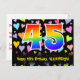 Framsidan av denna spännande, kärleksfulla och färgglada födelsedagstemat postkort visar en stor siffra "45" med ett regnbågsspektrum-gradering inspirerat mönster, tillsammans med meddelandet "Grattis på 45-årsdagen", och ett anpassningsbart mottagarnamn. Framsidan har dessutom ett livfullt och färgglatt kärleksfullt hjärtformigt bakgrundsmönster. Baksidan visar ett anpassat födelsedagsmeddelande, eller kan eventuellt lämnas tom om ett meddelande ska skrivas för hand istället. Ett anpassningsbart födelsedagskort som detta kan vara ett roligt sätt att erkänna någon på deras fyrtiofemte födelsedag. Postkort som detta kan också användas för att inbjuda gäster till en födelsedagsfest som hålls för någon