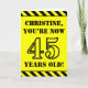 På framsidan av detta djärva och uppmärksammade födelsematerial finns ett anpassade namn och meddelandet "DU ÄR 45 ÅRS GAMLA!" i svart stencil inspirerade till text på gultens färgad. På framsidan finns också en svart och gult som flödar i öga upptill och i grund i kant. Insidan innehåller ett anpassat hälsning-födelsedagsmeddelande eller kan kanske tas bort och lämnas tomt om ett meddelande ska skrivas för hand i stället. Ett sådant här födelsedagskort i personligen kan vara ett roligt sätt att skicka önskemål till någon som firar sin fyrtiofemårsdag. [~Z0000413]