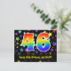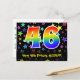 Framsidan av denna roliga, spännande och färgglada födelsedagskortdesign har en stor siffra "46" med ett regnbågsspektrum-gradering-mönster, tillsammans med meddelandet "Grattis på 46-årsdagen," och ett redigerbart mottagarnamn. Framsidan har dessutom ett färgglatt och livfullt bakgrundsmönster med stjärnformer i olika storlekar. Baksidan har ett redigerbart födelsedagsmeddelande, eller kan kanske rensas och lämnas tomt om ett meddelande ska skrivas för hand istället. Ett anpassningsbart födelsedagskort som detta kan vara ett roligt sätt att uppmärksamma någon på deras fyrtioårsdag. Postkort som detta kan också användas för att bjuda in gäster till en födelsedagsfest som hålls för någon som fyll