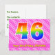 Framsidan av denna glada och kärleksfulla födelsedagskortdesign har en stor siffra "46" med ett mönster inspirerat av regnbågens färgskala. Den har också texten "Grattis på 46-årsdagen," och ett anpassningsbart mottagarnamn. Framsidan har dessutom ett glatt ljust rosa och mörkt rosa hjärtformsmönster och randigt mönster. Baksidan har ett redigerbart födelsedagsmeddelande, eller kan raderas och lämnas tomt om ett meddelande ska skrivas för hand istället. Ett anpassningsbart födelsedagskort som detta kan vara ett roligt sätt att skicka ett meddelande för att fira någon som fyller fyrtio-sex. Postkort som detta kan också användas för att inbjuda gäster till en födelsedagsfest som hålls för