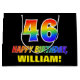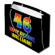 Den här färgstarka, roligt- och munkfärdiga presentväskan har ett stort nummer "46" och meddelandet "GRATTIS PÅ FÖDELSEDAGEN,", båda färgader med en regnbågsspektrumövertoning som inspirerade mönster, tillsammans med en fetstilt gult som kan redigeras av namn. Bakgrunden är svart på färgad. En roligt presentsäck av det här slaget kan användas när man slår in gåvor som ges till någon i firande på deras fyrtiosjätte födelsedag. [~Z0000477]