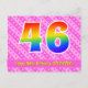 Framsidan av detta lycklig, rolig och kärleksfull vykortsdesign med födelsedagskalender har ett stort nummer "46" med en regnbågsspektrumövertoning som inspirerade mönster. Det innehåller också budskapet "Lycklig 46:e födelsedag" och ett anpassade som tar emot namn. På framsidan finns dessutom hjärtformer för rosa på ljusa rosa och mörk i lycklig och mönster i rand. Baksidan innehåller ett redigerbart hälsning-födelsedagsmeddelande, eller så kan det kanske rensas och lämnas tomt om ett meddelande ska skrivas för hand i stället. Ett sådant här vykort för anpassadets födelsedag kan vara ett roligt sätt att sända ett budskap i firande om någons fyrtiosjätte födelsedag. Sådana vykort kan också användas för gäster från inbjudan till en födelsedagsfest som hålls i förvar för någon som blir 46 år gammal. [~Z0000449]