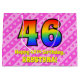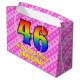 Den här lycklig och den 46:e födelsedagskalematerade presentväskan har ett stort nummer "46" med ett mönster inspirerat av ett regnbågsspektrum. Det innehåller också budskapet "Lycklig 46:e födelsedag", följt av anpassadet namn. Bakgrunden har en rosa i mörk och ett mönster i ljusa rosa rand som innehåller levande hjärtformer i rosa. En presentpåse som denna kan användas när man slår in presenter eller ger gåvor till någon som firar sin fyrtiosjätte födelsedag. [~Z0000414]