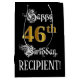 This opulent and fancy birthday gift bag design features the message “Happy 46th Birthday,”, plus a custom recipient name. Part of the message is in an ornate script-style text. The large number “46th” features a faux/imitation gold-inspired look pattern. The background is colored black. A birthday themed gift bag like this might be a respectable way to wrap a gift or present being given to somebody who is celebrating their 46th birthday. [~Z0000560]