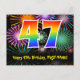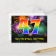 Framsidan av denna roliga, spännande och färgglada födelsedagskortdesign har en stor siffra "47" med ett regnbågsspektrum-gradering-mönster. Den har också meddelandet "Grattis på 47-årsdagen" och ett redigerbart mottagarnamn. Framsidan har dessutom ett livfullt och färgglatt bakgrundsmönster inspirerat av utseendet på sprängande festliga fyrverkerier. Baksidan har ett anpassat födelsedagsmeddelande, eller kan kanske rensas och lämnas tomt om ett meddelande ska skrivas för hand istället. Ett anpassningsbart födelsedagskort som detta kan vara ett roligt sätt att skicka ett meddelande för att fira någon:s fyrtiosjunde födelsedag. Postkort som detta kan också användas för att bjuda in gäster