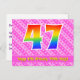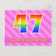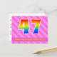 Framsidan av denna glada och lyckliga födelsedagskortdesign har en stor siffra "47" med ett regnbågsspektrum-gradering inspirerat mönster, tillsammans med meddelandet "Grattis på 47-årsdagen," och en personlig mottagares namn. Framsidan har dessutom ett glatt ljust rosa och mörkt rosa randigt mönster med hjärtformer. Baksidan har ett personligt födelsedagsgratulationsmeddelande, eller kan kanske rensas och lämnas tomt om ett meddelande ska skrivas för hand istället. Ett anpassningsbart födelsedagskort som detta kan vara ett roligt sätt att fira någon på deras fyrtio-sjunde födelsedag. Postkort som detta kan också användas för att inbjuda gäster till en födelsedagsfest eller kalas som hålls för någon som fyller