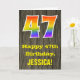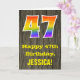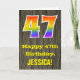 Framsidan på denna färgglada men ändå rustika födelsedagskortdesign har en stor siffra "47" med ett regnbågsspektrum-gradering-mönster, tillsammans med meddelandet "Grattis på 47-årsdagen," och en personlig mottagares namn. Baksidan på framsidan av kortet har ett rustikt falskt trästruktur-mönster. Insidan har ett personligt födelsedagsgratulationsmeddelande, eller kanske kan rensas och lämnas tomt om ett meddelande ska skrivas för hand istället. Ett födelsedagskort som detta kan vara ett roligt sätt att skicka födelsedagsönskningar till någon som firar sin fyrtio-sjunde födelsedag.