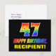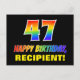 Framsidan av denna färgstarka, glada och roligt födelsedag med vykort har ett stort nummer "47" och meddelandet "GRATTIS PÅ FÖDELSEDAGEN", båda färgader med en regnbågsspektrumövertoning inspirerade mönster, tillsammans med en fet gult anpassningsbar mottagare namn. Framsidan har också en minimal bakgrund av svart färgad. Baksidan av vykortet har ett hälsning-meddelande på anpassningsbarnas födelsedag, eller kan kanske tas bort och lämnas tomt om ett meddelande ska skrivas för hand i stället. Ett så pass dynamiskt vykort för anpassadets födelsedag kan vara ett roligt för att fira någons fyrtiosjunde födelsedag. [~Z0000474]