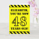 Framsidan på denna iögonfallande och djärva födelsedagskortdesign har ett personligt namn och budskapet "DU ÄR NU 48 ÅR GAMMAL!" i svart stenciltext på gul bakgrund. Framsidan har också ett iögonfallande mönster med gula och svarta ränder längst upp och nedre kanterna. Insidan har ett anpassat födelsedagsmeddelande, eller kan kanske lämnas tom om ett meddelande ska skrivas för hand istället. Ett personligt födelsedagskort som detta kan vara ett roligt sätt att skicka födelsedagsönskningar till någon som firar sin fyrtioåttonde födelsedag.
