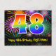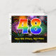 Framsidan av denna färgglada, roliga och spännande födelsedagstematiska postkortdesign har en stor siffra "48" med ett regnbågsspektrum-gradering inspirerat mönster, tillsammans med meddelandet "Grattis på 48-årsdagen", och ett anpassningsbart mottagarnamn. Framsidan har dessutom ett färgglatt och livfullt bakgrundsmönster inspirerat av utseendet på sprängande festliga fyrverkerier. Baksidan har ett anpassningsbart födelsedagsmeddelande, eller kan kanske rensas och lämnas tomt om ett meddelande ska skrivas för hand istället. Ett anpassningsbart födelsedagskort som detta kan vara ett roligt sätt att fira någon på deras fyrtioåttonde födelsedag. Postkort som detta kan också användas för att inbjuda gäster till