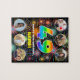 Den här roliga och spännande pusselpusslet med födelsedag har nummer "49" med ett dynamiskt multifärgat regnbågsspektrum som inspirerar gradienten mönster, tillsammans med meddelandet "LYCKLIG 49:e BIRTHDAY" och personlig namn, på ett flerfärgat brinnande fyrverkerier som inspirerade mönster. Nära överst och grund är bilder som kan vara personlig, kanske med foton av mottagaren och/eller mottagarens familj och vänner. Ett djärvt, anpassat pussel på födelsedagen kan användas för att bekräfta någons fyrtionionde födelsedag. (Photography © Storytree Studios, Stanford, CA.) [~Z0000664]