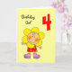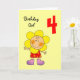 Fyra år gammal flicka i en blomsterdräkt, bakgrunden färg och texten är anpassade.