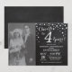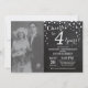 4-års bröllopsdag med eget foto. Kalk tavla svart och silver inbjudan. Fjärde bröllopsdagen. Kalk tavla svart och silver glitter diamant bakgrund. Silverkonfetti. Vuxen födelsedag. Kvinna eller man manlig födelsedagsfest. För ytterligare anpassning, klicka på "Anpassa"-knappen och använd vårt designverktyg för att ändra denna mall.