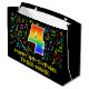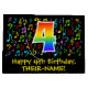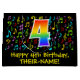Denna roliga, färgglada och livfulla födelsedagspresentpåse har en stor siffra "4" med ett mönster inspirerat av regnbågsspektrumet. Den har också texten "Grattis på 4-årsdagen" och ett redigerbart namn. En del av bakgrunden har ett mönster av olika notsymboler i olika färger och storlekar. En födelsedagstematiserad presentpåse som denna kan vara ett roligt sätt att förpacka en present som ges till någon som firar sin 4-årsdag.