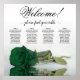 Detta fantastiska sittdiagram i bröllop har fyra bord med 10 sittplatser per bord och rymmer totalt 40 gäster. Diagrammet är försett med en sofistikerad och romantisk utformning som har ett enda ro i en rik djupt liggande grönt färg, som vilar delikataktigt på sin sida och kastar en reflektion i en serene bassäng i vatten. Diagramets titel, skriven i ett snyggt skript kalligrafi, välkomnar gästerna varmt med "Välkommen! Hitta bord" medan du lämnar tillräckligt med utrymme nedan för namnen på paret och bröllop. Elegantens sittplatsplan är ett charmerande och praktiskt sätt att välkomna och hjälpa dina gäster att hitta sina platser på din bröllopsmottagning.