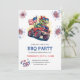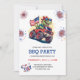 En söt och reflekterande inbjudan från stil 4:e juli med fyrverkerier och en coola T-rex som kör ett lera lastbil med USA flagga i bakgrafik. Perfekt för en bakgård BBQ party i Independence day.