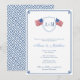 Denna klassiska bröllopsdusch eller co-ed bröllopsdusch design har en blå och vit vapensköld med utrymme för parets initialer. Detta flankeras av akvarell USA-flaggor, ursprungligen handmålade av mig innan de skannades till digital form. Du kan ändra färgen på den grekiska nyckelgränsen på framsidan och mönstret på baksidan genom att gå in i designverktyget och ändra bakgrundsfärgen på varje sida.