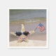 Starfisk med solglasögon och bikini som bär en amerikansk flagga i strandsand. Kan användas till 4 juli i party.