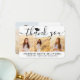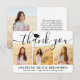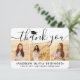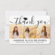 Skicka ett stilfullt tack med anpassade svartvita fotokollage med fyra bilder tackkort för examen. Alla bilder och texter är enkla att anpassa. (TIP: Ett enkelt sätt att centrera ett foto exakt som du vill är att beskära det innan du laddar upp det till Zazzle-webbplatsen.) Denna mall kan anpassas med valfri text, till exempel framtida utbildningsplaner, nytt jobb eller favoritcitat. Om du hellre vill skriva ditt meddelande för hand kan du helt enkelt ta bort exempeltexten eller använda det extra utrymmet ovanför den nya adressen och kontaktinformationen. Designen har en svart examenshatt, handskriven kalligrafi, modern minimalistisk typografi och fyra bilder som du väljer, till exempel seniorbilder eller bilder från examensceremonin. Dessa eleganta personliga kort är ett trendigt och chic sätt att tacka familj och vänner för att de delade din examensfirande. Grattis till examen!