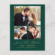 Denna enkla, minimalistiska Save the Date-kort har en fotokollage med tre bilder ovanför orden "Save the Date" i elegant guldbokstavsstil, följt av parets namn, bröllopsdatum och stad i sans serif-teckensnitt på en smaragdgrön bakgrund. Lägg till ett fjärde, horisontellt foto och ett mer detaljerat meddelande med ytterligare information på baksidan, tillsammans med din returadress.