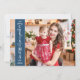 Modern Julhälsningar kort med ett fullt-utfallsfoto på framsidan med ett blått övertäckningsband på den lämnat lodrät, där texten "God jul" markeras i vitt. Du kan ladda upp ytterligare tre av dina favoritfoton från familjen och ditt personliga hälsning-meddelande på baksidan av kortet.