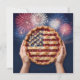 Två händer som stolt lyfter en körsbärspaj prydd med en vacker amerikansk flaggdesign, mot en strålande bakgrund av fyrverkerier.