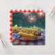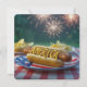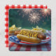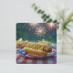 En festlig miljö med en het korv på en patriotisk tallrik, med ordet "AMERIKA" skrivet med senap.