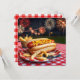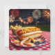 En varm korv med ordet "AMERIKA" skrivet i senap placeras på en patriotisk flaggduk med pommes frites.