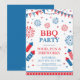 4 juli festlig grillfest inbjudan med ram, flaggor och fyrverkerier isolerade på vit bakgrund. Design för amerikanska självständighetsdagen inbjudningar. Anpassningsbar typografi i rött och blått.