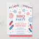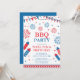 4 juli festlig barbecue-festinvitation med ram, flaggor och fyrverkerier isolerad på vit bakgrund. Design för amerikanska självständighetsdagen-inbjudningar. Anpassningsbar typografi i rött och blått.