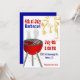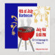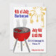 Storartad inbjudan till din fjärde juli grillfest i rött, vitt och blått. Grafik med en röd grill som grillar korvar och hamburgare och gyllene gula stjärnor och fyrverkerier i bakgrunden. Text i blått och rött är redo att anpassas för din högtidsfirande.