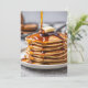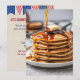 Hög stapel pannkakor med droppande sirap och en smörklump för en 4 juli-pannkakfrukost inbjudan.