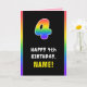 Det här pulserande och trevliga födelsedag med hälsningskortet har nummer "4" med ett färgstarkt regnbågsspektrum som inspirerar till gradienten mönster, tillsammans med meddelandet "LYCKLIG 4e födelsedagen," och en personlig mottagare namn. Insidan har ett anpassat hälsning-födelsedagsmeddelande, eller så kan det kanske rensas och lämnas tomt om ett meddelande ska skrivas för hand i stället. Ett sådant här bra, redigerbart födelsedag kan användas för att bekräfta någons fjärde födelsedag. [~Z0000636]