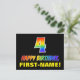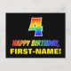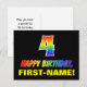 Framsidan av denna färgstarka, roligt- och fjällande vykortsdesign har ett stort nummer "4" och meddelandet "GRATTIS PÅ FÖDELSEDAGEN", som båda har en regnbågsspektrumövertoning som inspirerade mönster-färgning, tillsammans med en fet gult anpassningsbar mottagare namn. På framsidan finns också en enkel bakgrund för svart färgad. Baksidan av vykortet har ett hälsning-meddelande från anpassadets födelsedag, eller kan kanske tas bort och lämnas tomt om ett meddelande ska skrivas för hand i stället. Ett färglöst vykort för anpassadets födelsedag som detta kan vara ett roligt för att fira någons fjärde födelsedag. [~Z0000474]