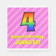 Den här roligten och den pappra napkin-designen i 4e födelsedagen är ett stort nummer "4" med en färgstark mönster inspirerad av ett regnbågsspektrum. Det innehåller också budskapet "Lycklig 4e födelsedagen,", följt av en personlig namn. Bakgrunden är en glad mönster av ljust rosa och mörk rosa rand som innehåller levande hjärtan i rosa. På födelsedagen kan pappra servetter som denna vara roligt till använda vid ett party som hålls för att fira någons fjärde födelsedag. [~Z0000417]