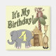 En safari-temat design av en giraffe, en apa sitta i ett träd, en stor elefant med nummer 4 på den, och text Det är min födelsedag om samordning av 4e födelsedagen t-shirts, knappar, partiinbjudningar, tackkort och porto. Samma som skjortor för resten av familjen och gästerna i party.