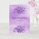 Framtill: Mjuk pastellultraviolett, graderad, ombre bakgrund. Med lila vattenfärgade blommor. Lila handskript, brev och texten: Lycklig 50:e födelsedagen. Mall för namn, lila färgad brev. Inuti: violett bakgrund och en blomma på varje sida. Utrymme för skriva för hand. Tillbaka: lila blommor.