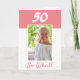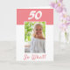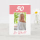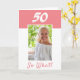 50-års födelsedag Inspirerande foto födelsedagskort. 50-års födelsedagskort med personligt välkomstmeddelande för en kvinna som firar 50-årsdagen. Den kommer med ett roligt och motiverande citat 50 Så vad! och är perfekt för en person med humor. Kortet är i rosa och vita färger. Infoga ditt foto i mallen. Du kan också ändra årtalet.