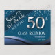 Spara datumet för high school- eller klassåterföreningskort. Blått tema med falskt silverfolie 50-årsjubileum och fet vit text. All text kan anpassas förutom '50' och kan ändras för dina egna festbehov. Klassflaggor finns också i min butik.