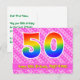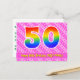 Framsidan av denna glada, kärleksfulla och glada födelsedagstemanade postkort visar en stor siffra "50" med ett mönster inspirerat av en regnbågsspektrumgradient. Den visar också meddelandet "Happy 50th Birthday," och en anpassad mottagarens namn. Framsidan visar dessutom ett glatt mörkt rosa och ljust rosa randigt mönster med hjärtformer. Baksidan visar ett anpassat födelsedagsmeddelande, eller skulle kunna tömmas och lämnas tom om ett meddelande ska skrivas för hand istället. Ett födelsedagskort som detta kan vara ett roligt sätt att skicka födelsedagsönskningar till någon som firar sin femtioårsdag. Postkort som detta kan också användas för att inbjuda gäster till en födelsedagsfest som hålls för någon som fyller