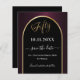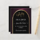 A Spara datumkortet för en 50:e födelsedagsfest. En svart och burgundisk bakgrund, dekorerad med faux guld arch. Anpassa och lägg till ett datum och ditt namn. Texten: Femtio och Spara datumet skrivs med ett stort trendig-handskript med stil. 1 lakan = 1 spara datumet som skrivs ut kant till kant.