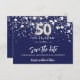 Ett giftigt och trendig Spara datumkortet för en 50:e födelsedagsfest. En marin blå färgad bakgrund. Dekorerad med faux silver-stjärnor. Texten: Spara datumet skrivs med ett stort trendig-handskript i stil. Nummer 50 skrivs med ett stil-teckensnitt i ballong.